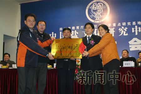 12月8日晚,四川省教育厅人文社会科学重点研究基地——中国盐文化研究中心授牌庆典在自贡市檀木林宾馆隆重举行。学院党委书记游建军、院长曾黄麟、副院长谢峰出席了仪式。四川省教育厅副厅长周同甫,四川省教育厅科技处处长李义为研究中心授牌,学院院长曾黄麟、四川久大盐业(集团)公司董事长傅刚义、自贡市盐业历史博物馆馆长黄健代表中心接牌。自贡市市委书记、市人大常委会主任唐坚、副市长刘国庆出席了授牌仪式并在主席台就坐。