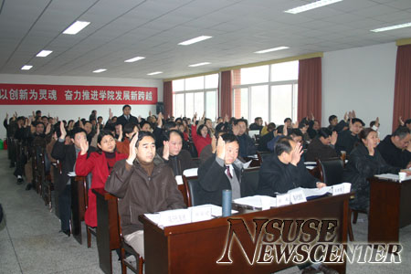为了贯彻落实党的十六大精神,充分发挥教职工的主人翁作用,推动学院的改革和发展,我院于 2005年12月28日在汇东校区召开了第一届第二次教职工代表大会。会议审议通过了《四川理工学院教职工福利费管理办法》,对学院校务公开进行了满意度测评,满意度为88.15%。党委书记游建军、院长曾黄麟、党委副书记唐健禾、李开世、副院长邓起方、龚敏、谢峰等在主席台前就座。125名正式代表和24名列席代表参加了会议。会议由执行主席唐健禾主持。