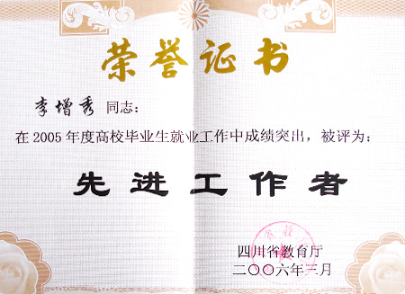 在3月15日--3月16日召开的2006年四川省高校毕业生就业工作暨表彰会议上,我院荣获“四川省普通高等教育毕业生就业工作先进集体”荣誉称号,学生工作部(处)就业指导中心主任吴玲、机电工程系党总支书记李增秀荣获“四川省普通高等教育毕业生就业工作先进工作者”荣誉称号。