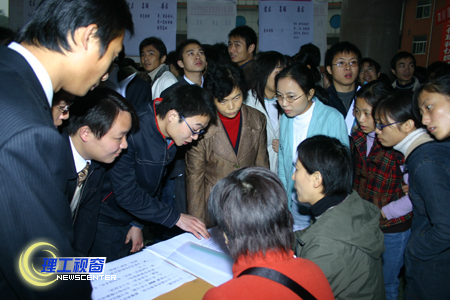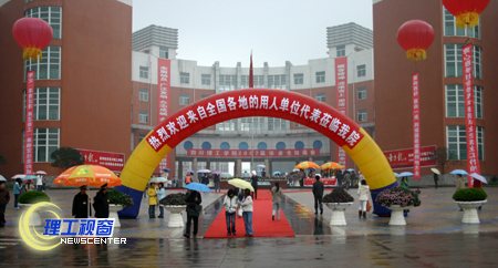 11月28日是我院一年一度双选会的日子。虽然天空飘着毛毛细雨,却丝毫没有减退同学们的热情,一大早,双选会还没有开始,同学们就握着简历,撑着雨伞在喷泉广场等待用人单位的到来。喷泉广场一派热闹喜庆的场面,各系的展板、五艳六色的雨伞、彩虹门、横幅标语构成了一道独特的风景。我院今年共有毕业生7000余人,招聘现场,200多家用人单位被求职者围得水泄不通。生工、机电、材化专业继续走俏。
