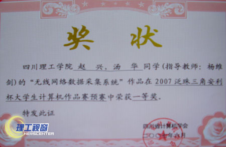 由四川省计算机学会主办、西南民族大学承办的“2007泛珠三角安利杯大学生计算机作品赛预、2007清华同方杯四川省大学生计算机作品赛”于2007年6月16日、17日在成都举行。由我院计算机科学系学生组成的代表队在本次比赛中共有11件作品获奖。其中,一等奖1件;三等奖2件;优胜奖8件,同时我校还获优秀组织奖。