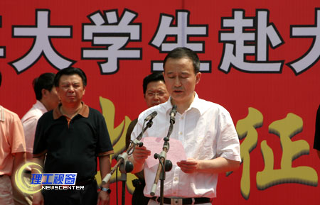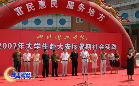 7月13日下午,四川理工学院隆重举行2007年暑期“三下乡”社会实践活动出征仪式。学院党政领导李开世、邓起方、钱维新,学院相关职能部门负责人,共青团自贡市委书记曹友良、副书记万春霞,以及大安区委副书记高小林、共青团大安区委书记刘勇、大安区妇联主任黄显容等出席了出征仪式,仪式由院团委副书记王建琼主持。