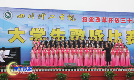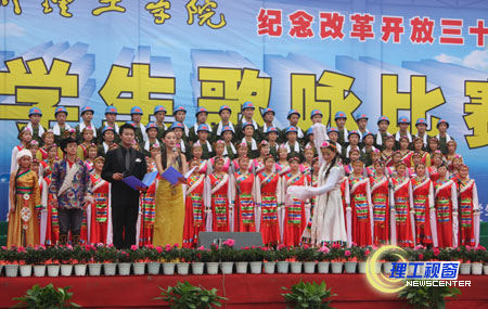11月12日下午,我校纪念改革开放三十周年大学生歌咏比赛在汇东校区篮球场举行。全校13个二级学院和基础教学部、体育部以及研究生院分别派代表队参加了比赛。学校党政领导游建军、唐健禾、李开世、刘康、蔡乐才和各二级学院(部)以及相关职能部门的领导观看了比赛。