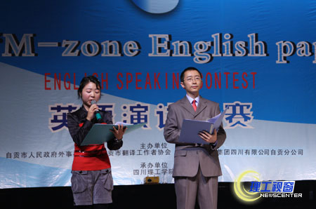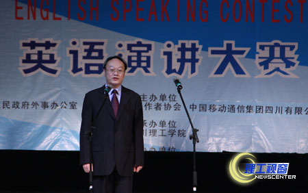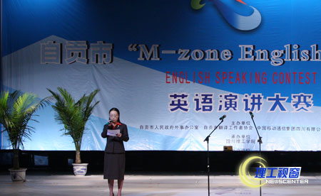 为庆祝中华人民共和国成立60周年和自贡市建市70周年,10月18日下午,由自贡市人民政府外事办公室、自贡市翻译工作者协会、中国移动通讯集团四川有限公司、自贡市分公司和四川理工学院共同主办的自贡市“M-ZONE ENGLISH PAPER”杯英语演讲大赛决赛在我校科学会堂隆重举行。我校党委副书记、自贡市翻译工作者协会副会长唐健禾教授致欢迎辞,自贡市人民政府副市长、自贡市翻译工作者协会名誉会长刘国庆,自贡市翻译工作者协会会长吴基泰,中国移动自贡公司等领导莅临了本次大赛。