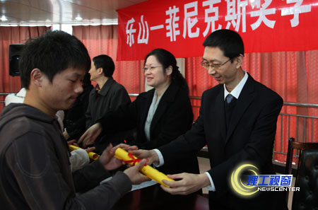 11月16日,学校首届乐山-菲尼克斯奖学金颁奖典礼隆重举行。学生处钱晓处长代表学校向菲尼克斯客人表示热烈欢迎,感谢企业对学校人才培养工作的大力支持,他希望广大学生向获奖同学学习,早日成才,回报社会。菲尼克斯半导体有限公司财务总监游明群代表公司向获奖的15名同学颁奖。机械工程学院党总支书记李增秀、自动化与电子信息学院总支书记宋弘、学生处副处长胡伟及各学院学生代表参加了此次典礼。获奖学生代表敬思勇同学在发言中说,菲尼克斯奖学金已经超越了物质的奖励,它在精神上传递着贵公司的创办初衷,那就是感恩社会,传承爱心,激励莘莘学子勤奋学习。