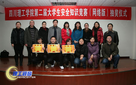 12月9日下午,学校第二届大学生安全知识竞赛(网络版)抽奖暨颁奖仪式在科学会堂学生就业指导中心举行。有关部门和二级学院的负责人分别通过网上随机抽取的方式分别抽取了一等奖2名、二等奖5名、三等奖10名以及优秀奖20名,并为获得优秀组织奖的二级学院(部)颁发了荣誉证书。通过现场抽奖,生工学院生物技术及应用专业2007及2班的李丽、材化学院工艺专业2008级2班的曾佑强荣获一等奖,计算机学院计算机科学与技术专业2008级1班的郑华等5名同学荣获二等奖,经管学院市场营销专业2008级1班刘洪寿等10名同学荣获三等奖,化药学院制药工程专业2008级3班的张智等20名同学荣获优秀奖。