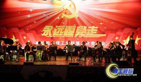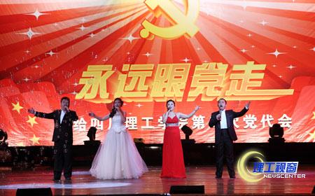晚会以舞蹈《忠诚》拉开序幕,激情澎湃的男生独唱《北京颂歌》,饱含深情的男女声重唱《祖国万岁》展现了建设中国特色社会主义的新进程。诗朗诵《金秋,我为党代会献礼》、歌伴舞《红旗颂》则赞美了广大党员在科技兴校、教书育人中所发挥的先锋模范作用。常青艺术团专家乐队器乐合奏《白毛女》赢得现场观众热烈的掌声。男声四重唱《弹起我心爱的土琵琶》、独唱《把一切献给党》雄壮浑厚、荡气回肠。