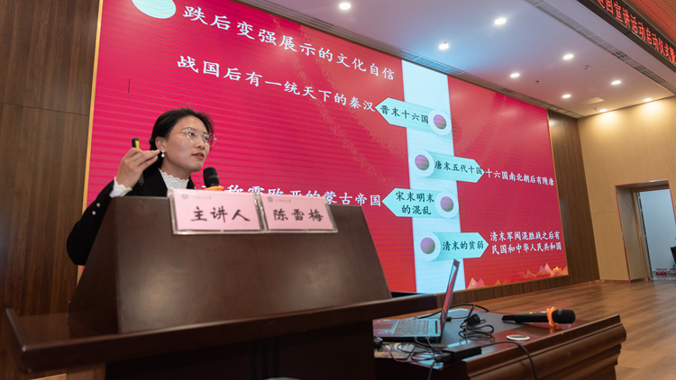 陈雪梅从文化概念界定入手,对文化的本质和内涵进行全面而深刻的讲解,同时从第一梯队给予的文化自信、跌后变强展示的文化自信、祖先基因赋予的文化自信、民族精神延续的文化自信四个方面阐述了“中国凭什么文化自信”,不仅凸显中国深厚的文化底蕴,更彰显在全球化浪潮中坚守文化立场、推动文明交流互鉴的坚定信念。她讲到文化的发展传播应以高级性、回报性和普适性为前提,在结合习近平总书记在宣传思想文化工作会议中提出的“七个着力”要求基础之上,以中国古代优秀传统文化和日常生活为例,提出了“道”“术”结合、古为今用、技术加持、化西为中、反向操作、烟火中国、民间智慧七个文化传播的思路想法。