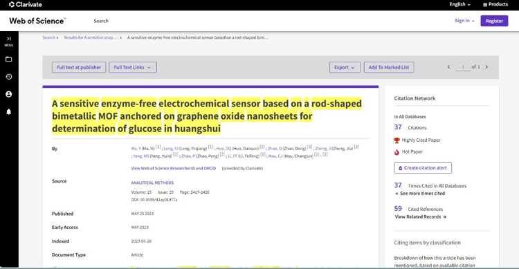 据近日公布的ESI(Essential Science Indicators)数据库最新统计数据显示,生物工程学院马懿教授作为第一作者在国际期刊“Analytical Methods”上发表的论文“A sensitive enzyme-free electrochemical sensor based on a rod-shaped bimetallic MOF anchored on graphene oxide nanosheets for determination of glucose in huangshui”入选ESI全球Top 1%高被引论文(ESI Highly Cited Paper)和ESI全球Top 1‰热点论文(ESI Hot Paper)。