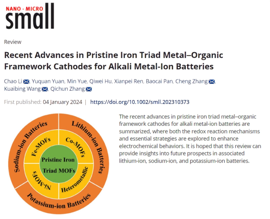 2024年1月4日,物理与电子工程学院“新能源物理创新团队”李超博士、袁玉全教授等在国际权威物理应用期刊《Small》(中科院一区,TOP,IF=13.3)上发表题为“Recent Advances in Pristine Iron Triad Metal-Organic Framework Cathodes for Alkali Metal-ion Batteries”的综述论文。李超博士为论文第一作者及通讯作者,四川轻化工大学物理与电子工程学院为论文第一署名单位。