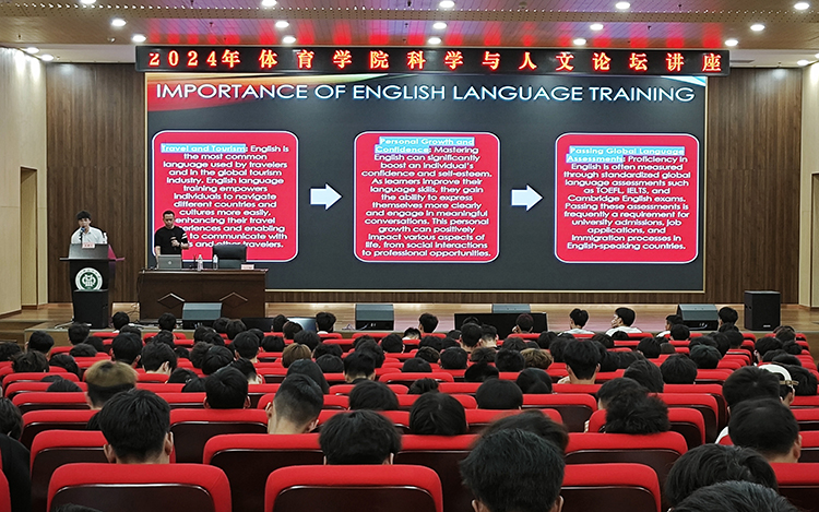 当天下午,Dapat博士在李白河校区学术报告厅开展了题为《Importance of English Language Training》的学术讲座,体育学院300余名师生到场聆听。Dapat博士介绍了亚当森大学针对多元化教育背景的学生开设的特色英语(第二语言)课程,讲授并演示了提升体育专业术语运用和日常对外交流等能力的方法与技巧,通过现场采访、交流互动和问卷测试等形式,激发学生学习兴趣,评估学生听说能力和写作水平,并于讲座结束后提供干预方案。整场讲座内容饱满、条理清晰、诙谐幽默,在场师生纷纷表示受益良多。