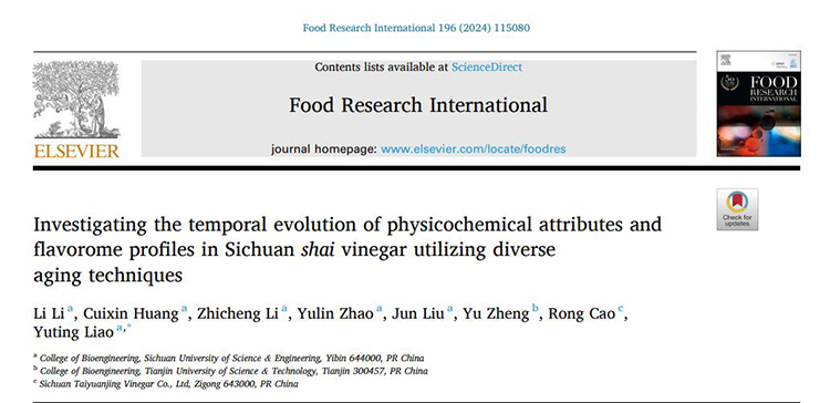 2024年9月19日,生物工程学院“调味品及食品加工副产物资源化利用”652科研创新团队李丽教授在《Food Research International》(中科院一区,TOP,IF=7.0)上发表题为“Investigating the Temporal Evolution of Physicochemical Attributes and Flavorome Profiles in Sichuan Shai Vinegar Utilizing Diverse Aging Techniques”的研究论文,四川轻化工大学生物工程学院为论文第一署名单位。