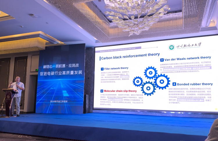 在当天的主题报告中,陈建介绍了炭黑的主要生产技术,以及表面结构,活性测定等前沿研究情况,指出主要用途是用于汽车轮胎。在多年的高分子物理教学中,他发现现有理论对炭黑提高耐磨性的解释存在不足。主流理论虽能解释部分实验现象,但无法预测炭黑加入量与性能关系等问题,而他提出的炭黑表面高硬度概念及完整的炭黑补强耐磨三要素理论,具备预测与判断功能。