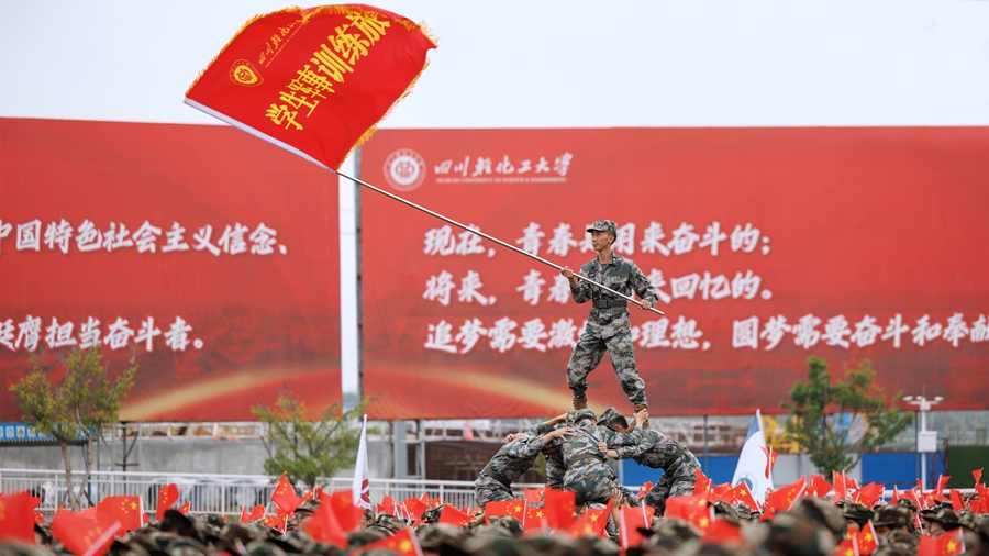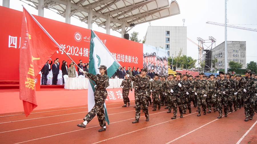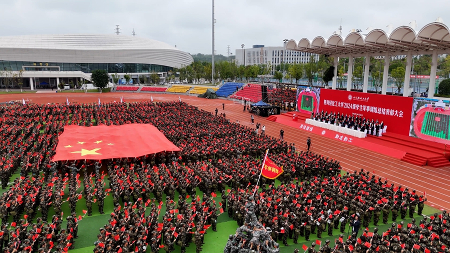 在《歌唱祖国》的歌声中,一面巨大的国旗在队伍中传递,2024级新生军事训练总结表彰大会圆满结束。