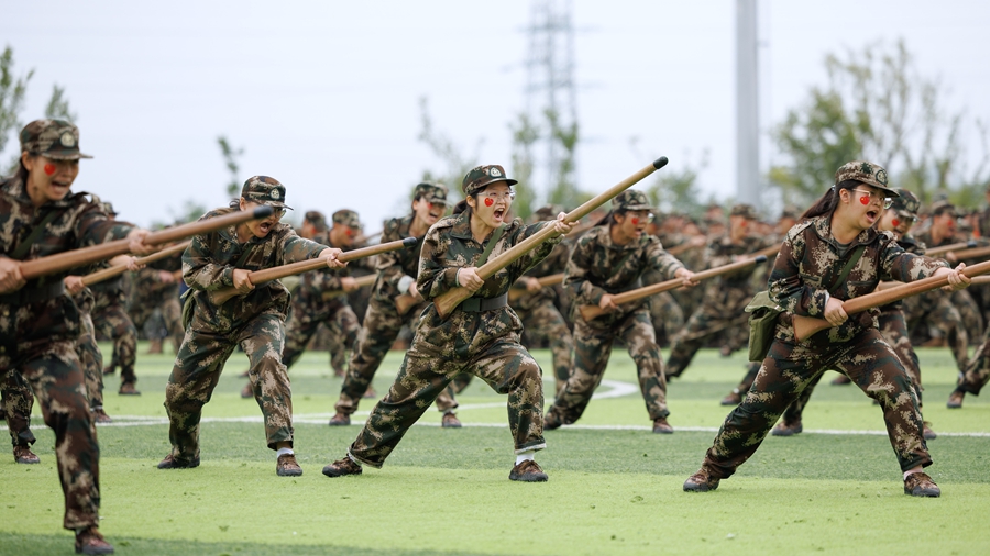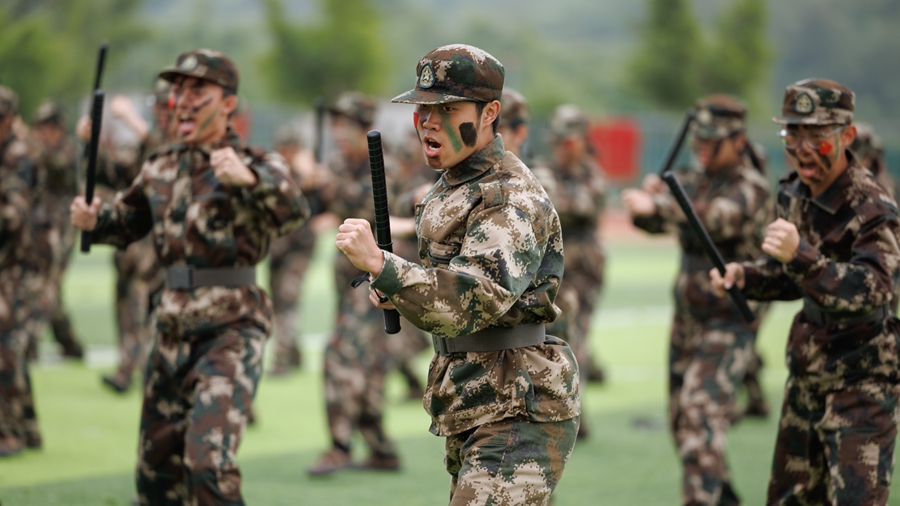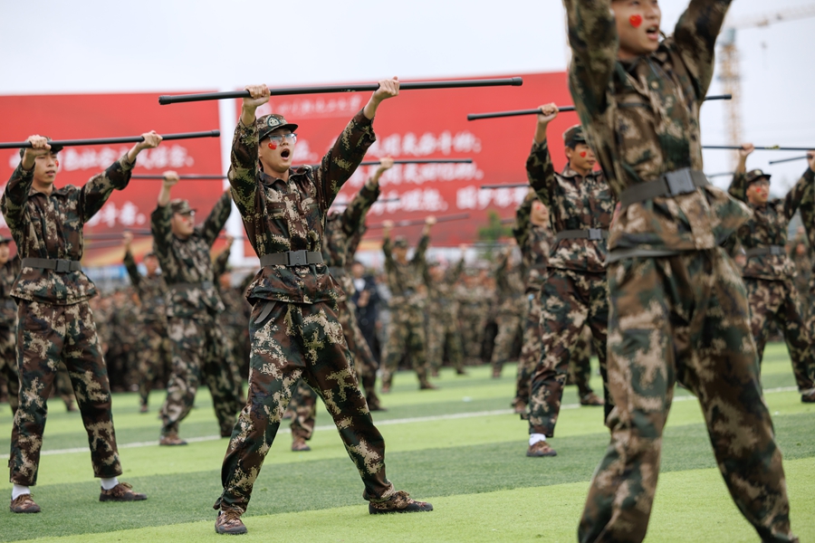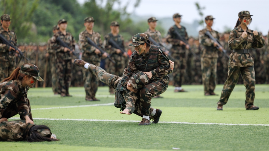 紧接着,是军事技能展示环节。棍术、匕首格斗术、警棍术、刺杀术、战术表演等项目轮番上演,同学们动作标准,气势如虹,充分展示了军训期间所学的军事技能和应急处理能力。特别是由特训班组成的战术表演,更是将军训的严谨性与实战性体现得淋漓尽致,赢得了满堂喝彩。
