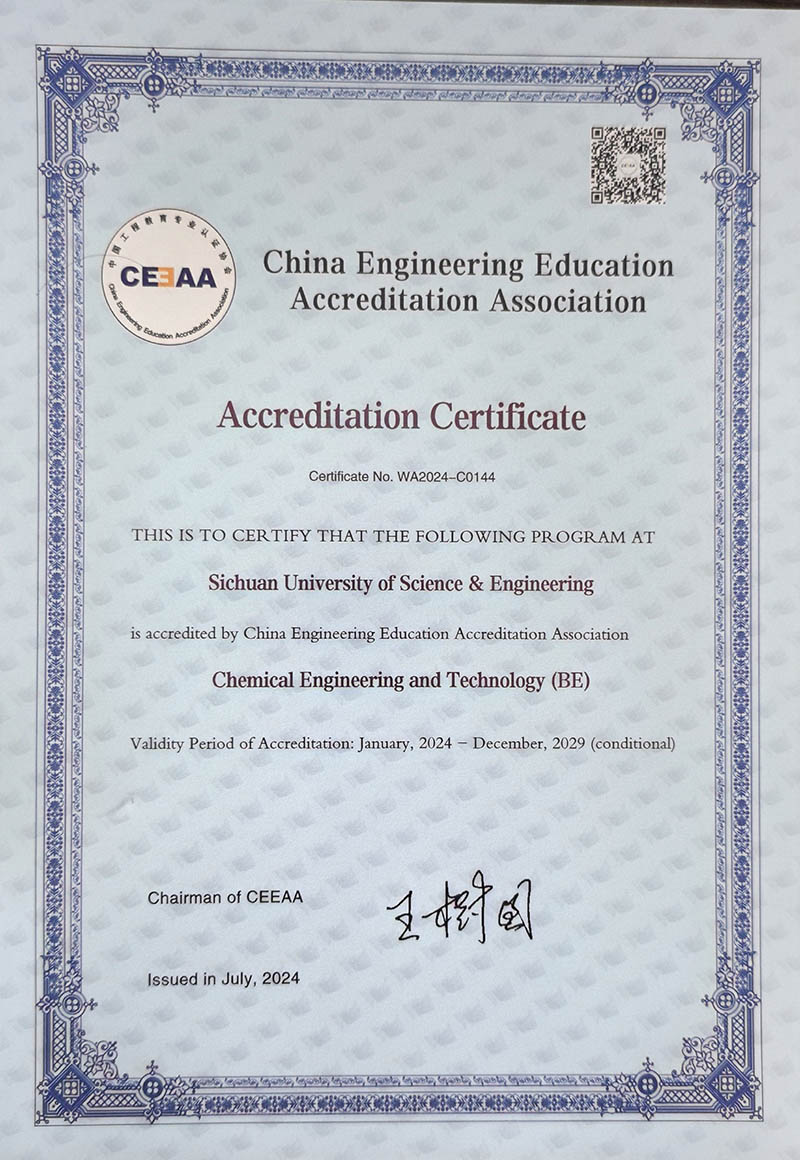 2014年,四川轻化工大学化学工程与工艺专业首次通过了工程教育专业认证。2017年,化学工程与工艺专业第二次通过工程教育专业认证,有效期6年。2022年,化学工程与工艺专业第三次向秘书处提交认证申请并获得受理,专业自评报告于2023年顺利通过化工制药类专业认证委员会的严格审核,工程教育认证专家组于同年10月进校实地考察,对化学工程与工艺专业的教学资源、师资力量、学生素质及支持条件等给予肯定。