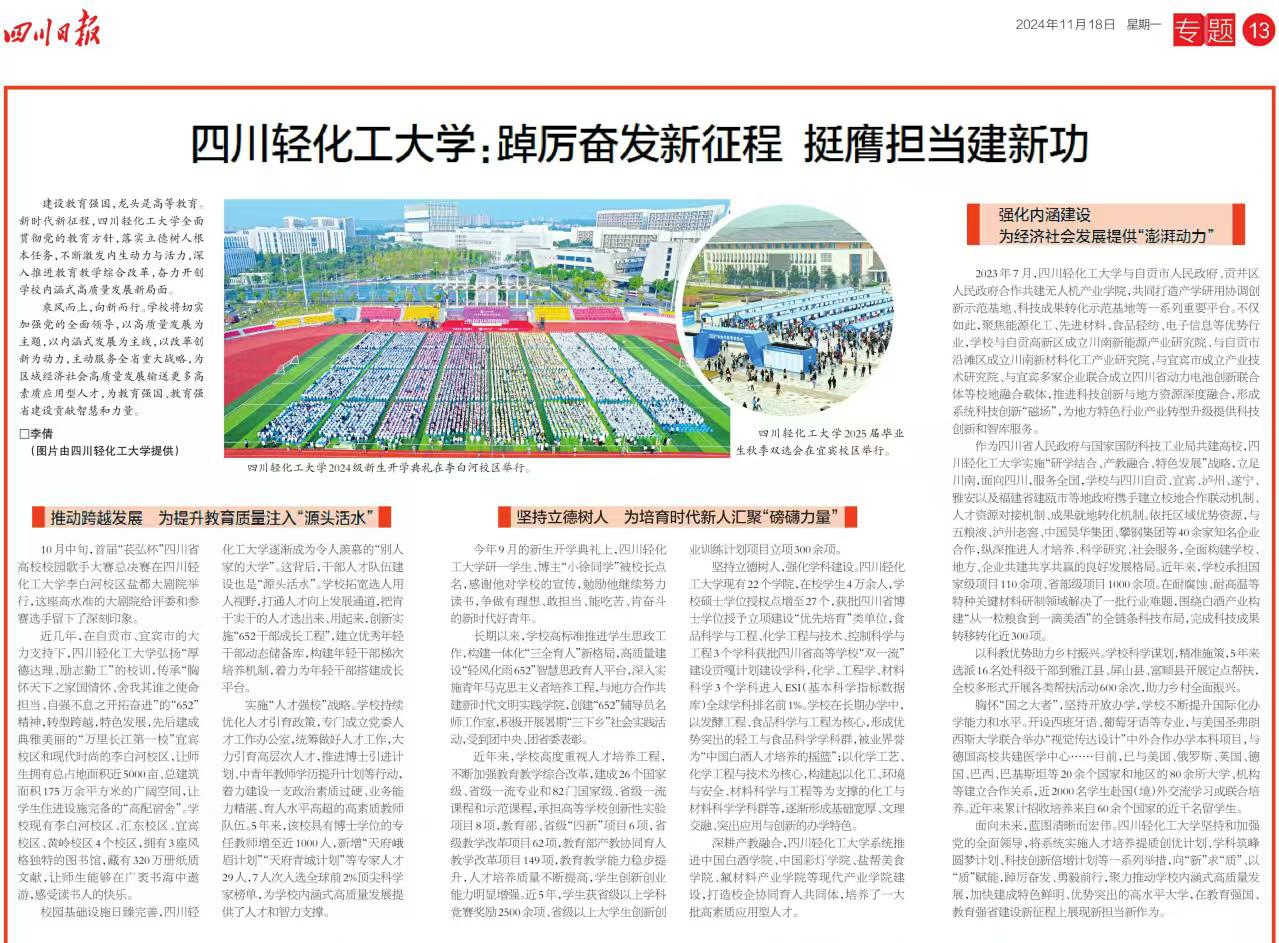 面向未来,蓝图清晰而宏伟。四川轻化工大学坚持和加强党的全面领导,将系统实施人才培养提质创优计划、学科筑峰圆梦计划、科技创新倍增计划等一系列举措,向“新”求“质”、以“质”赋能,踔厉奋发、勇毅前行,聚力推动学校内涵式高质量发展,加快建成特色鲜明、优势突出的高水平大学,在教育强国、教育强省建设新征程上展现新担当新作为。