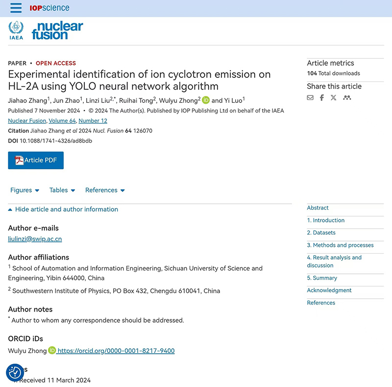 近日,我校自动化与信息工程学院 “652智能无人系统技术研究”团队在《Nuclear Fusion》(中科院一区,Top,IF=3.5)上发表题为“Experimental identification of lon Cyclotron Emission on HL-2A using YOLO neural network algorithm”的研究论文。
