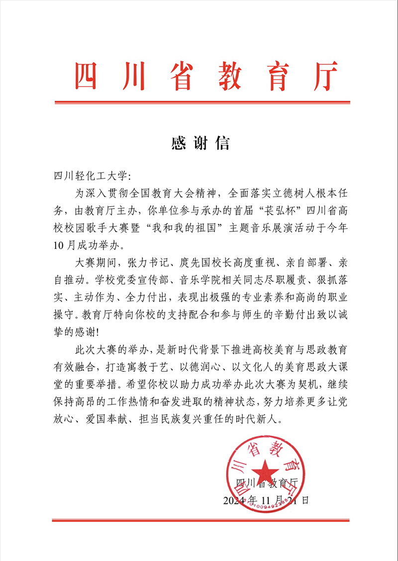 11月21日,四川省教育厅向学校发来一封感谢信,对我校在首届“苌弘杯”四川省高校校园歌手大赛暨“我和我的祖国”主题音乐展演活动中的积极承办和支持配合表示感谢。