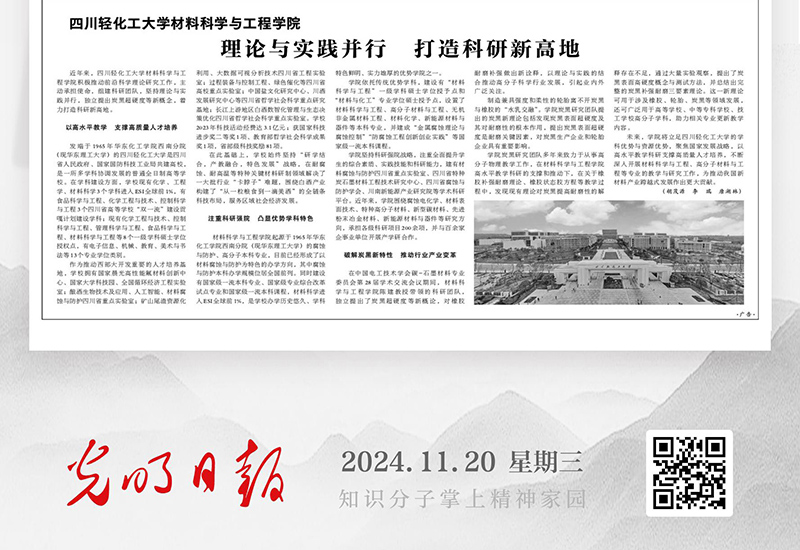 11月20日,《光明日报》第9版以《理论与实践并行 打造科研新高地》为题,聚焦国家发展战略,报道学校主动承担使命,以高水平教学科研支撑高质量人才培养,推动我国新材料产业高质量发展。其中,对材料科学与工程学院陈建教授带领的科研团队推动前沿科学理论研究情况进行呈现,讲述了该团队对橡胶耐磨补强做出颠覆性诠释、推动高分子科学行业发展、成功破解百年汽车轮胎黑色之谜等事迹。