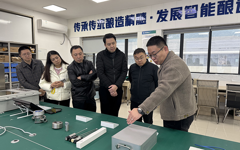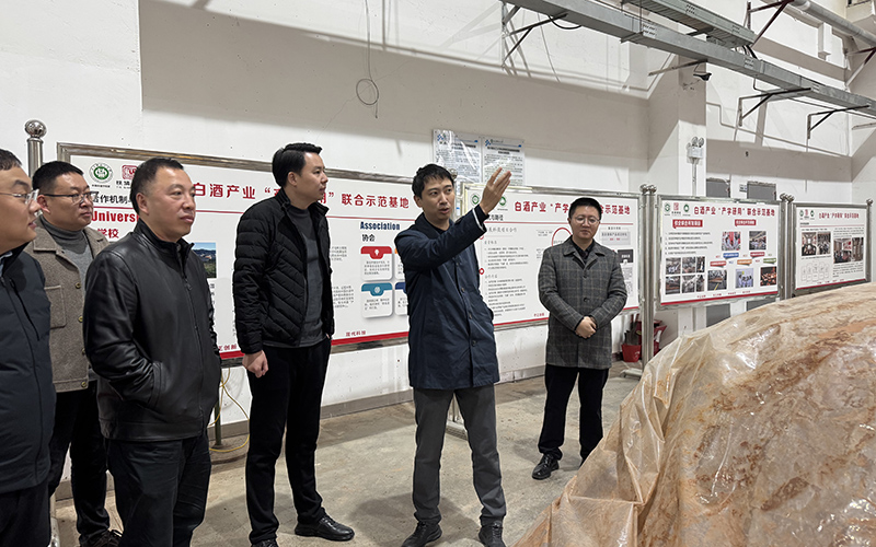 随后,调研团队前往我校宜宾校区,对食品与酿酒工程中试基地和白酒智能化酿造实验室进行了实地考察。我校生物工程学院党委副书记马懿和自动化与信息工程学院张贵宇老师向调研团队介绍了“一粒种子到一滴美酒”的全工艺链智能化、数字化灯塔工厂发展建设。