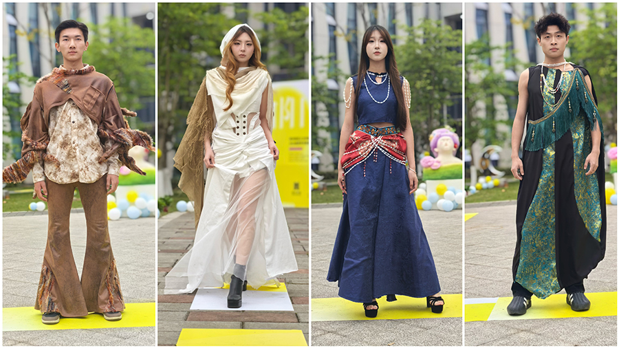 本次采风考察分为省外和省内两条线路,“川南线”的同学们将所学知识结合三星堆、蜀道等文化元素和夏布等非遗工艺,将中国传统文化、古蜀元素进行现代诠释;“西北线”前往甘肃、陕西等地的同学们将敦煌元素、雅丹地貌、少数民族文化与沙漠风情融汇在作品中,以服装服饰实现对西北辽阔宏伟地貌的转化。每件参展作品都反映着这些未来的设计师对服装艺术的思考。