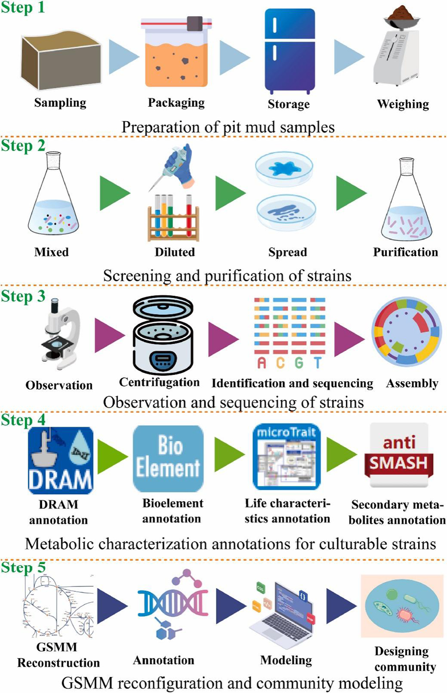 窖泥微生物群落对浓香型白酒的产量和风味品质有着重大影响。该研究利用多种窖泥微生物分离菌株的基因组注释以及基因组规模代谢模型(genome scale metabolic model,GSMM),来分析它们的代谢能力和代谢相互作用,并预测有助于特定代谢物生物合成的种间相互作用。通过多种培养条件分离出了 68 株窖泥菌株。在属的水平上,Bacillus、Enterococcus、Enterobacter、Acinetobacter、Rummeliibacillus和Lactococcus占主导地位。对各种纯菌株培养物的基因组进行了注释,凸显了它们的代谢以及生物地球化学循环(例如碳循环、氮循环和硫循环)。这些菌株呈现出一种层级性状空间,包括资源获取、资源利用和抗逆性,有利于适应窖泥环境。构建了这 68 株菌株的GSMMs,模型预测显示这些菌株具备生物合成 223 种不同代谢物的代谢潜力。以 17 种特定代谢物为目标产物进行群落建模表明,存在 24 种具有活性的生物合成物种,其中Lysinibacillus mangiferihumi和Providencia manganoxydan是必不可少的,另外 22 种是可替代的。它们可以组合形成 270 个亚群落。这些研究结果为全面分析窖泥微生物的代谢功能及相互作用提供了一种有效的方法,也为设计用于生产特定窖泥风味化合物的人工微生物群落提供了理论支持。