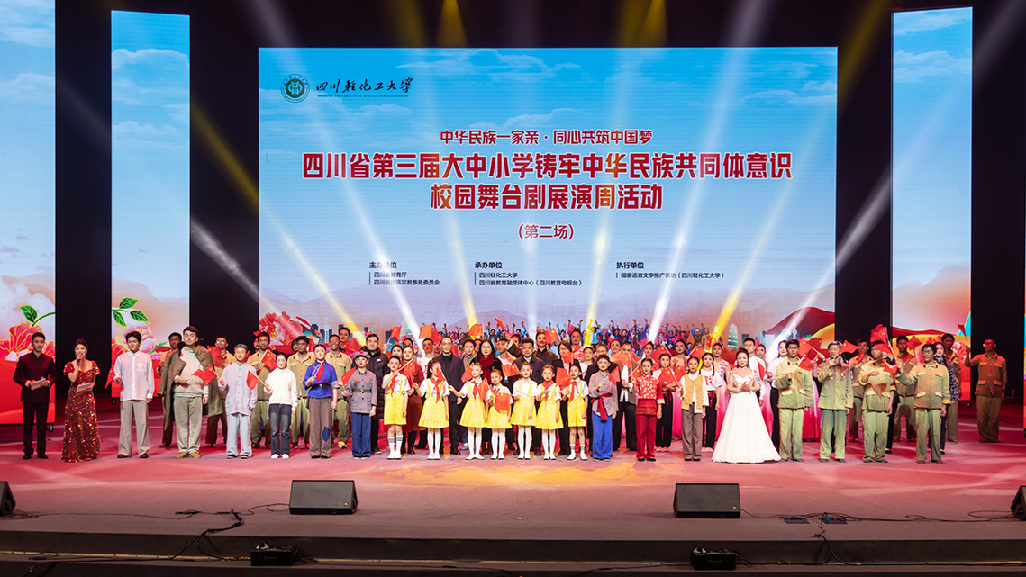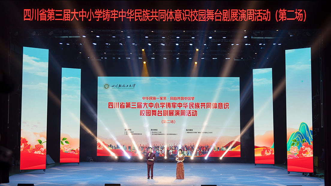 为深入学习贯彻党的二十大精神,深化民族团结进步教育,铸牢中华民族共同体意识,3月17日下午,由四川省教育厅、四川省民族宗教事务委员会联合主办,四川轻化工大学、四川省教育融媒体中心(四川教育电视台)承办,我校国家语言文字推广基地为执行单位的“四川省第三届大中小学铸牢中华民族共同体意识校园舞台剧展演周(第二场)”在我校李白河校区盐都大剧院举行。四川省民族宗教委教科语文处二级调研员张丽萍、四川省教育厅民族教育处副处长华泽懋、我校党委副书记陈一君及统战部、宣传部领导出席活动,并与师生共同观看了一场展现民族团结精神的文化盛宴。
