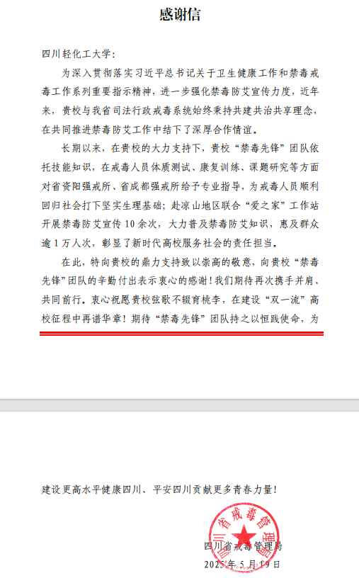 近日,我校禁毒志愿服务工作陆续收到各级禁毒委和戒毒管理局的感谢信,标志着学校在禁毒领域的深耕取得显著成效。