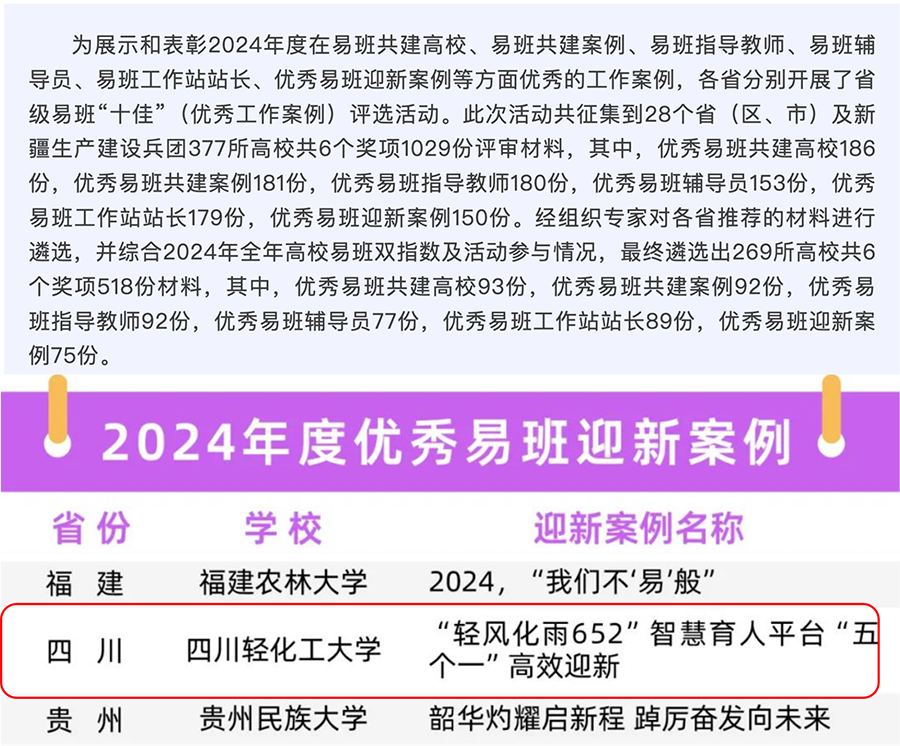 6月13日,教育部易班发展中心正式公布2024年度全国易班共建优秀名单,我校申报的《“轻风化雨652”智慧育人平台“五个一”高效迎新案例》成功入选,荣获“2024年度优秀易班迎新案例”称号。这一荣誉既是对我校易班学生工作团队数字化建设能力的权威认证,更是对学校“以学生为中心”理念的充分肯定。