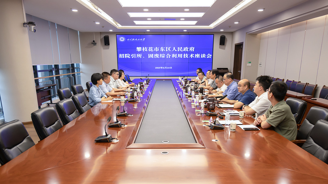6月24日上午,攀枝花市东区人民政府园区党工委委员、管委会副主任宋楠川一行莅校交流,就“招院引所”及固废综合利用技术进行座谈。