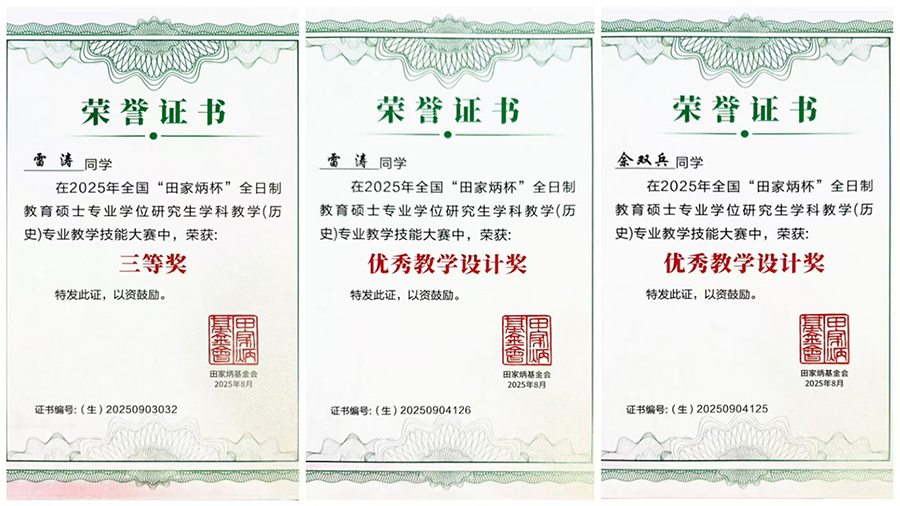 我校人文学院历史系学科教学(历史)专业研究生雷涛、佘双兵在指导教师王潇带领下参赛并取得优异成绩。雷涛获决赛三等奖及“优秀教学设计奖”,佘双兵获“优秀教学设计奖”,展现了我校学子的专业素养与教学能力。