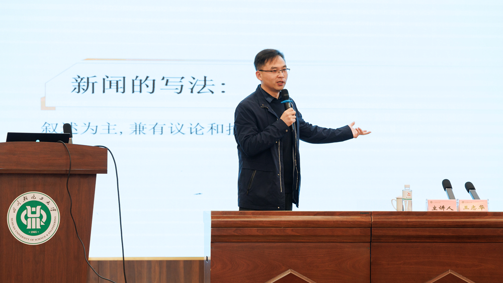 四川大学文学与新闻学院王志华副教授应邀作专题讲座。他围绕“新时代高校新闻宣传工作的规律与方法”,结合实例系统讲授了消息、通讯、评论等文体的写作要领,深入剖析了标题拟定、导语写作等环节的常见问题与改进方法,为参训人员提供了系统的业务指导和全新视角。