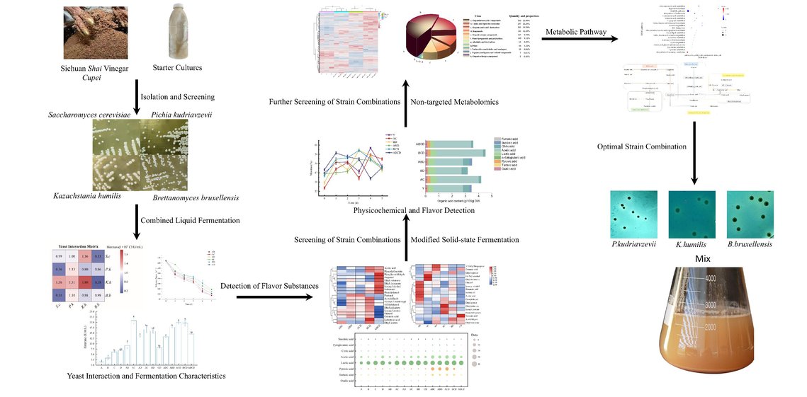 四川晒醋作为我国传统发酵食品的瑰宝,其复杂的微生物生态一直是科研界关注的焦点。本研究聚焦于四川晒醋固态发酵早期(1-5天)的酵母微生物群落,通过共培养、代谢组学及模拟发酵等技术手段,对酿酒酵母(Saccharomyces cerevisiae)、库德里阿兹威毕赤酵母(Pichia kudriavzevii)、哈萨克斯坦酵母(Kazachstania humilis)和布鲁塞尔酒香酵母(Brettanomyces bruxellensis)这四种关键酵母菌株展开深入探究,成功解析了它们各自的功能定位。此项研究首次系统阐明了四川晒醋固态发酵早期关键酵母菌株在风味形成与发酵进程中的独特角色,为合成微生物发酵剂的设计及传统发酵食品的标准化生产奠定了实验基础,有望在保障传统风味传承的前提下,助力我国发酵食品行业迈向标准化、智能化的新发展阶段。