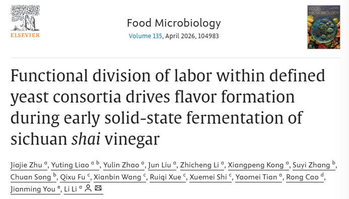2025年11月14日,食品学院“调味品及食品加工副产物资源化利用”652科研创新团队李丽教授在《Food Microbiology》(中科院一区,TOP,IF=4.6)上在线发表题为“Functional division of labor within defined yeast consortia drives flavor formation during early solid-state fermentation of Sichuan Shai vinegar”的研究论文。论文第一作者为我校2023级研究生朱嘉杰与廖钰婷博士,通讯作者为李丽教授,该研究工作得到了四川轻化工大学科研创新团队计划(SUSE652B003)的支持。